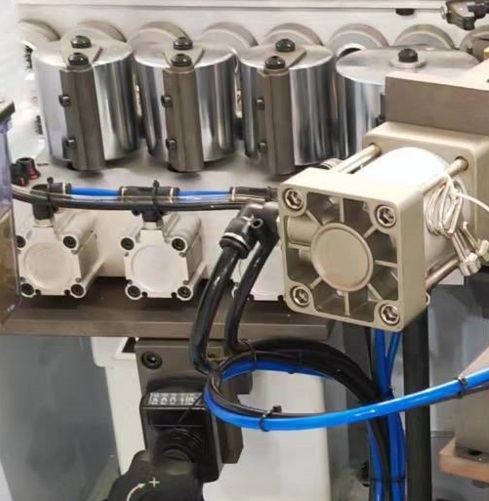 ПРЕСС ГРУППА Состоит из одного ведущего ролика и трех до прессовочных роликов, которые обеспечивают надежную фиксацию кромочного материала на торец заготовки. На каждом ролике установлен отдельный пневмоцилиндр. 2 ролика из 4-х роликов имеют разный конус, что обеспечивает распределение усилия прижима по толщине детали. Давление на пресс группе задается с помощью пневматики, что гарантирует равномерное распределение усилий на кромку во время приклеивания. |