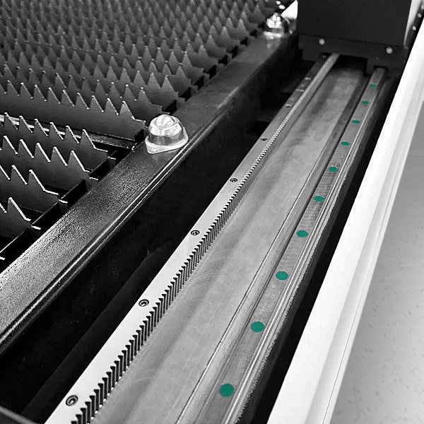 Косозубая зубчатая рейка Передача по осям X, Y станка осуществляется по зубчатой рейке. За счет применения реечной передачи увеличивается точность работы станка, также и скоростные параметры, увеличивая скорость холостого перемещения. |