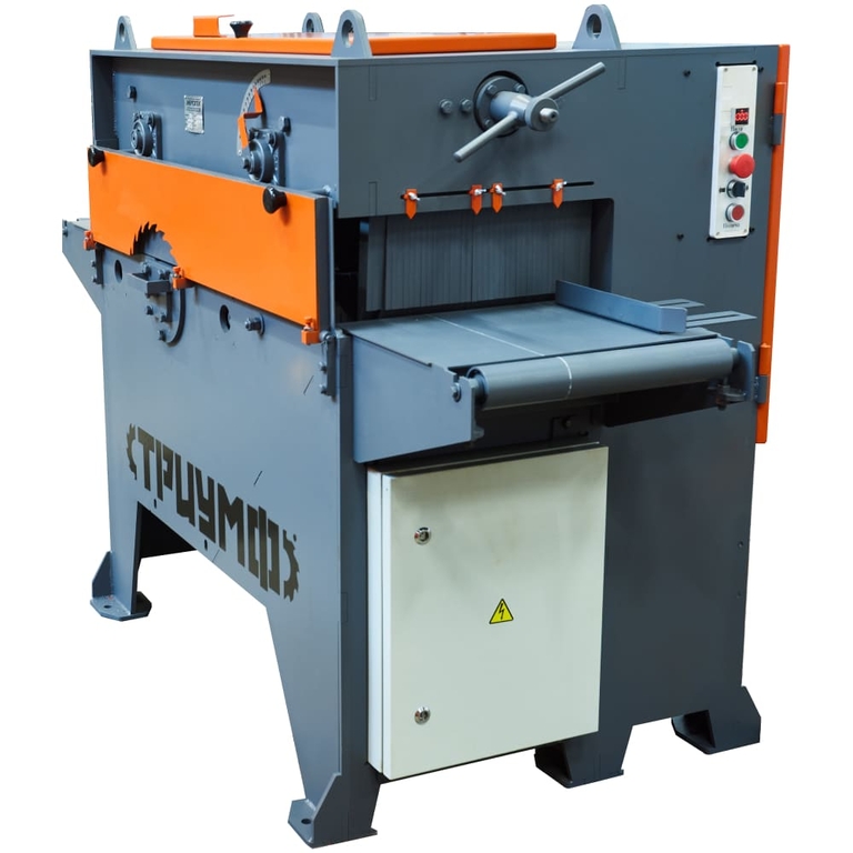 Многопильный станок Триумф 300 предназначен для распиловки двух, трех-кантного бруса (лафета) на обрезной пиломатериал (доска, брус).В конструкции станка применена технология листовой сборки статины, а также применяется в тяжелых бревнопильных и двухвальных многопильных станках. Данная конструкция является более жесткой по сравнению с рамными и более устойчивой к нагрузкам при работе. Триумф 300- многопильный одновальный дисковый станок на котором производится протяжка пиломатериала при помощи приводных рябух. Многопил имеет надежную когтевую защиту, предотвращающую обратный ход пиломатериала при работе.