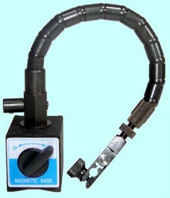 Стойка гибкая с магнитным основанием предназначена для крепления измерительных головок ( как с ушком, так и без ушка, а так же индикаторных головокголовок типа ИРБ). На нижней поверхности основания стойки выполнена призматическая выемка, позволяющая закреплять на цилиндрических поверхностях. Диаметр отверстия под индикаторную головку - 8 мм; Рабочий угол перемещения инструмента - 150 град.; Длина гибкого стержня - 350 мм; Габариты магнитного основания - 60х50х55 мм; Вес 1.3кг; На головке крепления индикатора имеется винт для тонкой регулировки подвода индикаторной головки к измеряемой поверхности.