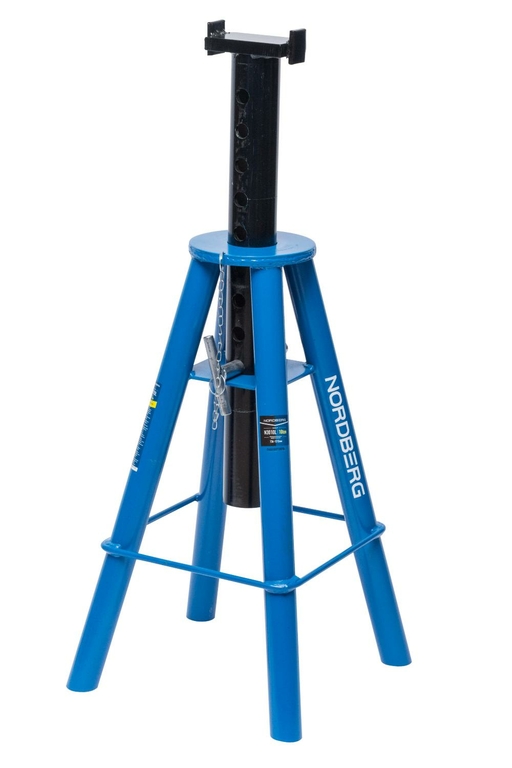 Стойка механическая под авто высокая Nordberg N3010L для фиксации и страховки при поднятии автомобиля, для выполнения ремонтных работ. Высота подхвата регулируется. Фиксация производится с помощью пальца, который вставляется в отверстие и не дает штанге двигаться. Страховку от случайного выпадения с помощью цепочки.