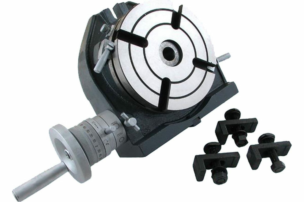 Стол поворотный горизонтально-вертикальный предназначен для применения в качестве дополнительной оснастки фрезерных станков. Конструкция корпуса стола позволяет его использование как в горизонтальном, так и в вертикальном положении, в том числе с применением задней бабки для надежного закрепления, при фрезеровании винтовых канавок и другой фрезерной обработки деталей типа «вал». Поворотный стол является необходимым приспособлением при выполнении операций кругового фрезерования, при выполнении и обработке различных элементов деталей расположенных через угловые расстояния. Стол поворотный обладает достаточной жёсткостью благодаря применению кривошипного устройства для фиксации планшайбы после перемещения на нужный угол.