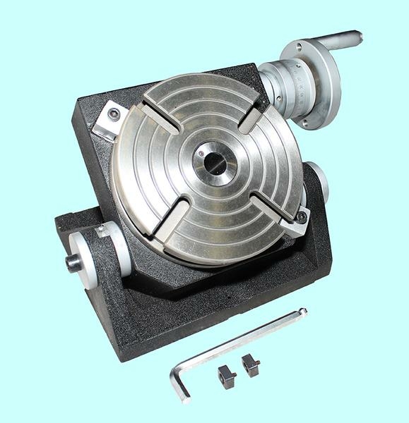 Стол поворотный наклоняемый предназначен для применения на фрезерных и сверлильных станках как дополнительная технологическая оснастка. Поворотный наклоняемый стол незаменим при фрезеровании поверхностей различного профиля расположенных под углом, изготовления и обработки отверстий, и других металлообрабатывающих работ с технологическим требованием выполнения одной операцией, без переустановки обрабатываемой детали. Поворотный стол имеет возможность наклона от 0° до 90°, где в последнем случае при обработке некоторых типоразмеров деталей рекомендуется применение задней бабки с регулируемым наклоном пиноли и изменяемой высотой центра от основания. Диаметр стола 200мм.