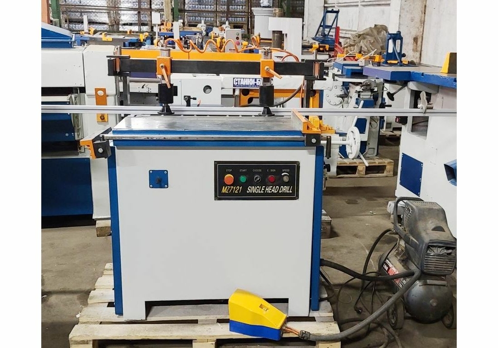 На станке M7121A обрабатывают пласти и кромки плитных материалов и массива, сердя в них отверстия с нужными размерами.