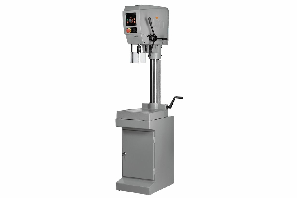 Станок FLOTT SB 23 Plus представляет собой сверлильный и резьбонарезной станок, оснащенный ЧПУ, УЦИ, устройством автоматического включения реверса при достижении метчиком заданной глубины нарезания резьбы. Регулировка оборотов в диапазоне 20-2000 об./мин. осуществляется в плавном режиме и возможна даже во время работы станка. Нарезание резьбы до М16х1 осуществляется с помощью резьбонарезного патрона без участия ходовых винтов, что исключает необходимость их замены при смене типа резьбы Функции ЧПУ заключаются в управлении включением реверса при нарезании резьбы. Оператор устанавливает необходимую глубину резьбы на устройстве цифровой индикации (ЖК-дисплей). При нарезании резьбы ЧПУ отслеживает текущее положение метчика по глубине, сравнивает полученное значение с установленной и включает реверс без вмешательства оператора.