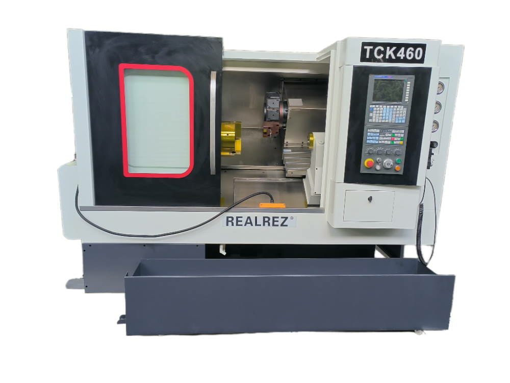 Токарный станок с ЧПУ Realrez ТCK 460X350 с наклонной станиной (GSK988TA) предназначен для токарной обработки в один или несколько проходов в автоматическом цикле наружных и внутренних поверхностей деталей типа тел вращения со ступенчатым и криволинейным профилем. Диаметр обработки над станиной 460 мм. Диаметр обработки над суппортом 170 мм.Станок Realrez ТCK 460X350 с наклонной станиной (GSK988TA)оснащен приводным инструментом с возможностью радиальной и осевой обработки. Данная функция позволяет использовать этот станок, как токарно-фрезерный центр. Данный станок предназначен для выполнения токарных операций чистовой и получистовой обработки, в том числе обработка отливок из чугуна, за счёт применения высокоскоростного шпинделя. Перемещения по осям происходят по высокоточным направляющим качения HIWIN TAIWAN, устойчивым к воздействию вибрации. Они обладают высокой жёсткостью и позволяют вести токарную обработку со снятием больших припусков. При наличии соответствующего программного обеспечения (CAD/CAM систем) – залога эффективной эксплуатации станков с ЧПУ – перенастройка станка инженером-технологом занимает минимальное время. Требуется просто сменить программу, что сокращает на 80-90 % трудоемкость переналадки по сравнению с трудоемкостью этой операции на станках с ручным управлением и обеспечивает индивидуальность любой сложной детали.Станок позволяет выполнять основные операции механической обработки: точение наружных поверхностей, расточки отверстий, внутренних криволинейных поверхностей конической формы, обработка наружной и внутренней резьбы, дуг, разворачивания отверстий. Подходит для скоростной обработки черных и цветных металлов. Станки нашли широкое применение в автомобилестроении, приборостроении, изготовлении деталей электроники, аэрокосмической, военной и других отраслях промышленности. Станки обеспечивает высокую эффективность, большие объемы и высокую точность обработки.Токарный станок с ЧПУ ТCK 460x350 с наклонной станиной и системой управления GSK988Ta – это современное оборудование, предназначенное для высокоточной обработки металлических заготовок. Станок сочетает в себе надежность, производительность и удобство эксплуатации, что делает его идеальным выбором для механообрабатывающих производств, машиностроения, авиакосмической отрасли и инструментального производства.
