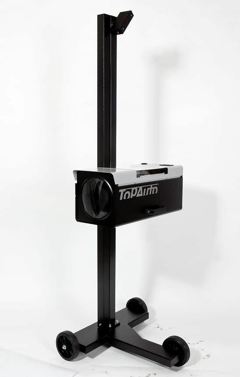 - Устанавливается на вертикальную мобильную стойку с тремя прорезиненными колесами; переднее колесо оснащено эксцентриком для регулировки положения прибора по отношению к горизонту