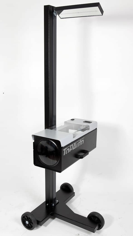 - Позиционирование прибора относительно транспорта осуществляется по зеркальному визиру, зафиксированному в верхней части неподвижной стойки. Регулировка положения визира под рост оператора производится при помощи удобной ручки.