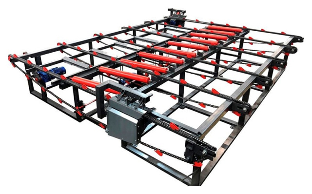Подающий конвейер Подача заготовок происходит при помощи 6-ти лучевого конвейера с одинарной тяговой усиленной цепью ПР-25,4 с максимальной нагрузкой на разрыв 60 тонн. Такая цепь не вытягивается и подача заготовки на пилу происходит всегда под прямым углом. Каждый луч на подающем конвейере имеет жесткие упоры для подачи досок. Все упоры выставлены в один уровень, что дает высокое качество и перпендикулярность реза. Шаг между упорами 560 мм позволяет торцевать доски шириной до 400 мм. По желанию Заказчика возможна установка толкателей на цепях подающего конвейера с другим шагом. |