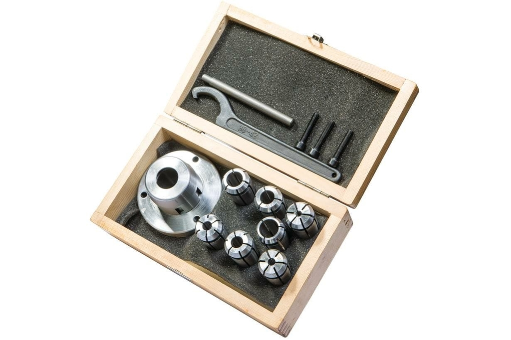 Цанговый патрон с цангами – представляет собой универсальную оснастку для работы на токарном оборудовании фирмы JET. Патрон имеет прочную и надежную конструкцию, обеспечивающую быструю смену цанг переходного, различного типа для последующей установки необходимого инструмента. Оснастка обеспечивает надежное крепление и фиксацию режущих инструментов с цилиндрическим хвостовиком диаметром 4,6,8,10, 12, 14 и 16 мм, обеспечивая выполнение токарных работ широкого спектра. Патрон комплектуется 7 переходными цангами и зажимным ключом.