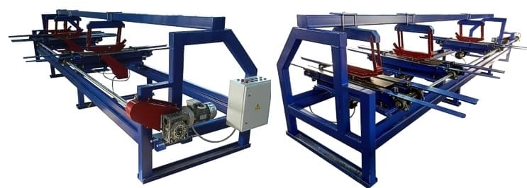 - Оснащение станка зубчатыми рейками для электрического или механического (штурвального) перемещения пильных узлов