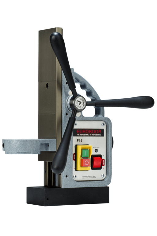 Универсальная магнитная стойка для дрели Euroboor F16+ предназначена для сверления, нарезания резьбы, рассверливания и зенковки отверстий с использованием ручной дрели. В комплект включены кольца-переходники для установки дрели диаметром 33, 38 и 43 мм (кольцо-переходник 43 мм установлено в стойке F16+). Мощный магнит силой 1200 кг. обеспечивает надежный захват во время работы. Сверлильная стойка F16+ является идеальным решением для задач сверления малого диаметра. Вес стойки – 7,5 кг, диапазон сверления спиральными свёрлами от 1 мм до 16 мм. Удобный транспортировочный кейс в комплекте.