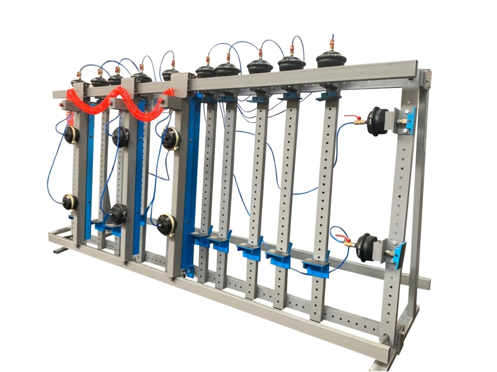 10 пневматических вертикальных струбцин, для удерживания заготовок в сжатом состоянии во время склеивания; Индивидуальные вентили для независимого отключения пневмоцилиндров. |